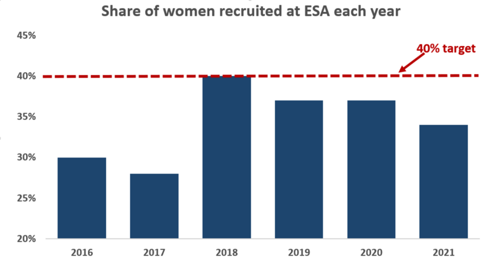 This trend of increased female representation at all levels should be sustained towards the objective of a gender-balanced workforce. ESA has set a target of ensuring that 40% of new recruits annually are women, along with actions to ensure gender diversity in evaluation panels and using gender-inclusive language. We will also tackle the gender balance in the organisation of panels at conferences and events.