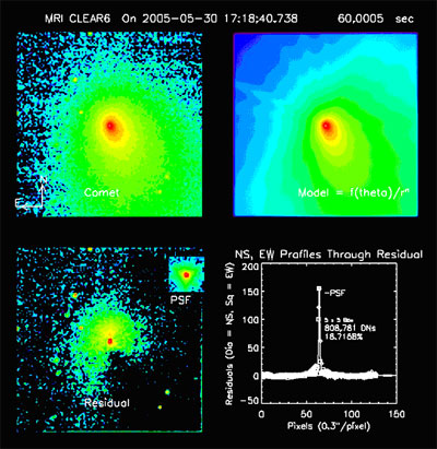 As illustrated in the figure, Deep Impact images taken on May 29-31 contain a well-formed coma with a detectable point source at the position of the brightest pixel. The brightness of the nucleus as determined from these images was close to that predicted from earlier observations with the Hubble and Spitzer space- telescopes and observations from large telescopes on the ground. At present, the nucleus contributes about 20 percent of the total brightness near the center of the comet.
