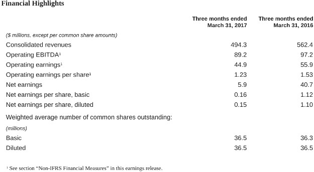 Operating earnings1 were $44.9 million, or $1.23 per share1, compared to $55.9 million, or $1.53 per share, for the first quarter of 2016. The decrease reflected lower operating EBITDA, as well as higher corporate expense, additional non-cash interest expense following the securitization of orbital receivables and a higher effective income tax rate on operating earnings.