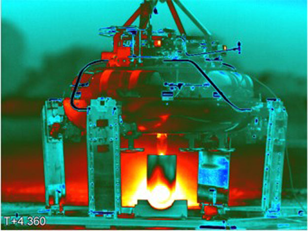 Infrared (IR) image of the Moon Express MTV-1X lander test vehicle during hot fire test at the Kennedy Space Center. (Image courtesy: NASA)