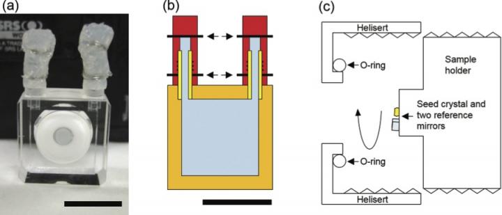 (a) The white ring is a ceramic helical insert on which the screw sample holder is placed. The scale bar is 10 mm. (b) The body of the growth cell is made of quartz glass (orange). Two capillaries of quartz glass with rubber stoppers (yellow) are fixed to the body with an adhesive. Tubes of elastomer (red) are attached to each capillary. After the growth cell is filled with the growth solution (light blue), the tubes are closed with metal wires (arrows). (c) Schematic illustration of the growth cell. Credit: K. Tsukamoto et al/Tohoku University